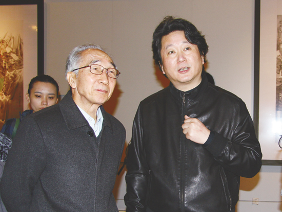 原中国美协主席、著名画家靳尚谊与张江舟在展览现场