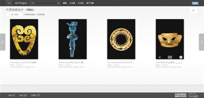在谷歌艺术计划中,用户可以点击浏览艺术作品,并能看到关于此艺术品的中英文简介。图为中国文化遗产标志“太阳神鸟”金饰。