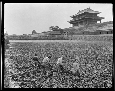 故宫筒子河(护城河)外采莲子的人。