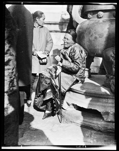 在甘博的相机下,一百年前北京居民的生活被一一展现。有一张图是一个缠足的老太太穿着绫罗绸缎,戴着男人的瓜皮帽,手中拄着文明棍,嘴里还叼着烟嘴。“这种多种文化的剧烈冲突,只有在民国初年才找得到。”韩朴说。