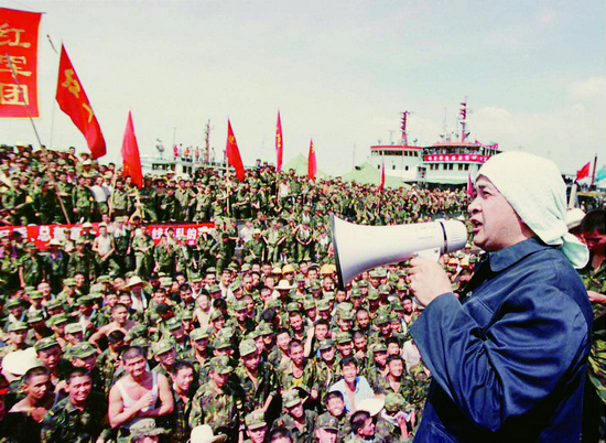 1998年,时为解放军总政歌舞团演员的黄宏在堵死的九江市长江大堤溃口处演出,慰问抢险官兵。中新社 赵振清 摄