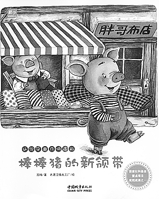 “苏梅童话绘本系列”图文并茂,是作家、画家通力合作的成果。我看了这套绘本,深切地感到它既是用语言文字讲故事,也是用图画讲故事,可说是文字、绘画并重,各自用不同的方法、手段来表现故事的同一个主题,两者的融合浑然一体。画家的作品精致、清新、特色鲜明、富有个性,不仅贴切、完整地表达了作家提供的文本内容,而且挖掘了、更加突出了故事中一些生动有趣的情节、细节,从而更充分地发挥了绘本的艺术魅力。例如,在《棒棒猪的新领带》中跳跳猴弯着腰、低着头从裤裆下倒着看棒棒猪为他缝补好了的裤子的画面,突出那两个圆形大洞,巧妙地融入数学知识,传神、幽默、好玩,富有想象力,增强了作品的艺术效果。