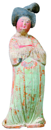 出土于西安市长安区茅坡唐墓的彩绘拱手仕女俑,梳抛家髻,面庞红润,肥胖而不臃肿,身躯微微扭转,右肩略抬起,朱唇含笑。