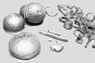 图为二战时被苏军带走的“巴尔金上尉收藏”中的金器。 柴野摄