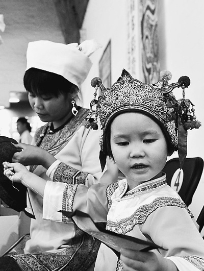 7月11日,北京798时代空间,祖孙三代在展示水族马尾绣。当日,“2013多彩贵州·民族民间手工艺品走进北京”展览开幕,上百年的蜡染珍藏品以及刺绣等一批贵州非遗精品与观众见面。