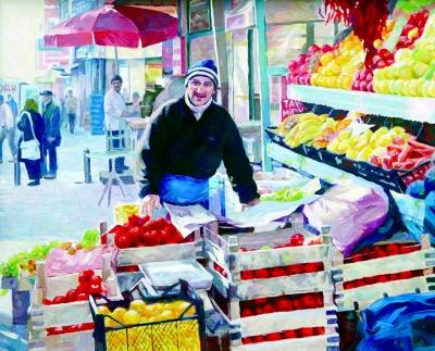 回国后,我根据收集的素材创作了一批反映土耳其风情的绘画作品,并参加了由中国文化部和土耳其驻华使馆共同举办的“神秘土耳其”画展。画展中的一幅《街头市场》描绘了伊斯坦布尔海边市场的生动情景和快乐热情的商贩,从一个侧面展现了土耳其人民的幸福生活。土耳其驻华大使穆拉特·萨利姆·埃森利在欣赏这幅画时,称赞这幅画十分真实生动,说自己甚至可以从画中认出这个商贩来自土耳其的哪个地区。大使夫人十分喜欢并私人收藏了这幅画。