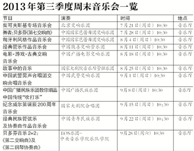 开始于2008年1月的“周末音乐会”是大剧院艺术普及的品牌栏目,5年多来一直坚持票价40元,剧院会员票价10元的低票价策略。目前,“周末音乐会”第三季度的排期已经确定并开始售票,第三季度将有13场音乐会,演出内容涵盖交响、管乐、民乐、歌剧等,将有多位中外艺术家加盟演出。7月21日的柴可夫斯基专场会由比利时籍国际音乐大师彼德利兹带来钢琴演奏;而8月4日的匈牙利风格作品音乐会将有美女钢琴家佩特拉·吉斯参与。
