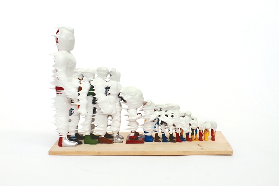 尤伦斯当代艺术中心(UCCA)于近日举办展览“金氏彻平:卓之物”,综合呈现了日本艺术家金氏彻平于2012年夏季在UCCA驻留期间特别创作的一系列装置、拼贴和录像作品。在《卓之物》中,金氏彻平大量使用日常商品,如呼啦圈、购物车、塑料恐龙、人形玩偶、马克笔……并把它们安插在雕塑装置及纸板拼贴作品中,尽管这些现成品“素材”自身已非常完整——并具有一定的象征意义,他却能够利用它们经过重新组织再创造成弗兰肯斯坦式的新形式。艺术家将白色树脂烧融浇筑在“杂物堆”上,树脂向下流淌甚至完全覆盖了某些物品,逐渐降温变硬、并且汇聚于基底,使得雕塑装置中各个物品的单独意义变得更加模糊。