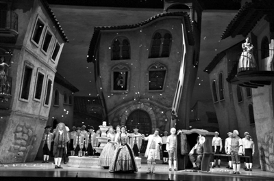 在上周六晚的演出中,廖昌永(右一)饰演的费加罗表现出色。实习生 栗世民 摄