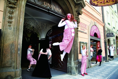 布拉格老城古香古色,古老而精美的建筑、街头音乐艺人、提线木偶表演和人们最熟悉的鼹鼠、帅克的纪念品令人目不暇接,然而最让人眼前一亮的是那些在街头扮成小丑的艺人。图为艺人为招徕顾客,别出心裁地为商家做广告,其中一人在后面操纵,一人在前面空中漂浮、旋转,做出很多复杂的动作,滑稽幽默、既像魔术又像杂技,让许多游客感到格外新奇并驻足一看究竟。