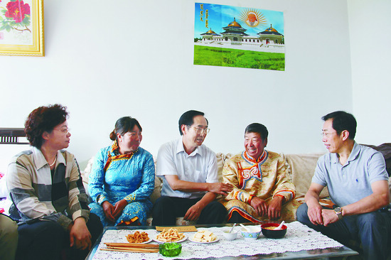 黄花沟嘎查是此次文化交流慰问团在内蒙古走访牧民的最后一站。得知艺术家们要来看望自己,牧民武永继、敖特更夫妇早早就在村口等着,热情地把大家迎到家里,连说:“感谢首都艺术家来看望我们,给我们带来了精彩的文艺节目。”