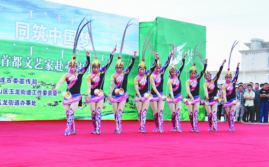 在赤峰会展中心剧场的演出是此次交流活动的首站。当晚,舞蹈《踏歌》、杂技《俏花旦——集体空竹》、歌曲《北京的胡同》《草原上升起不落的太阳》《接风洗尘》,以及戏曲、相声、口技、魔术和乐器演奏等节目纷纷登场,王春来、彭艳琴、王平、孙云岗、于海燕、李学义、梁子、方浩然、松岩、杨广业、张萌杰、尹浩、杨冲等艺术家和演员各亮绝活,倾情演绎。剧场里笑声不断,掌声连连。此外,艺术家们还在赤峰书画院进行了笔会交流,并走进玉龙广场为社区居民进行了演出。