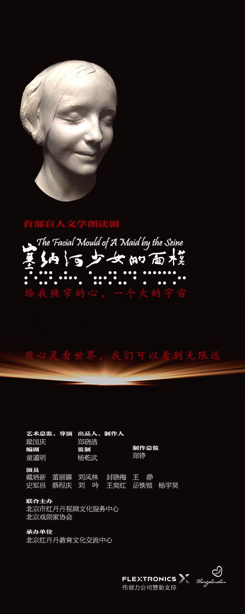 2013年8月8日,由北京市红丹丹视障文化服务中心、北京戏剧家协会联合主办的中国首部盲人话剧《塞纳河少女的面模》将在国家话剧院先锋剧场进行首演。该剧全体演员均由视障人士担任,我国著名戏剧评论家及俄罗斯文学翻译家童道明先生担任编剧,北京戏剧家协会副主席、秘书长杨乾武先生担任监制;国家话剧院国家著名演员梁国庆先生以文化志愿者身份担任艺术总监、导演,著名影视演员郑铮担任制作总监。北京市红丹丹视障文化服务中心联合北京市戏剧家协会主办,北京红丹丹教育文化交流中心出品,伟创力(中国)独家支持。主办方红丹丹表示,希望该剧的演出不仅具有传承和弘扬中国传统文化的意义,同时也是希望唤起社会各界对视障群体给予更多关注和理解,让视障群体拥有更多平等参与社会与展示自我的窗口。此前,该剧于8月3日在北京大学生戏剧节开幕式短暂亮相,并将陆续在武汉、长沙、南昌、深圳和东莞等地陆续开展公益巡演。