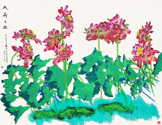 黄永玉先生当天身着一件颜色鲜亮的黄色上衣,显得格外精神、充满活力,这与他乐观向上的性格不无关系。现居北京东郊万荷堂的他,很爱画荷,如其创作的《九荷之祝》中,荷花亭亭玉立盛放于夏日,莲叶相接,绿意盎然,不畏骄阳地展现出一片生机。众所周知,黄永玉先生多才多艺,涉猎极为广泛,包括小说、雕塑、版画、插图、彩墨、陶瓷、建筑及庭院设计等诸多领域,他的创作视角独到,并敢于突破陈规、直抒胸臆,而提起他的水印套色木刻《阿诗玛》、彩墨纸本《猫头鹰》《庚申年》、生肖猴邮票设计更是家喻户晓。