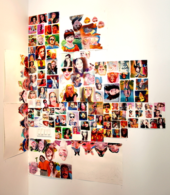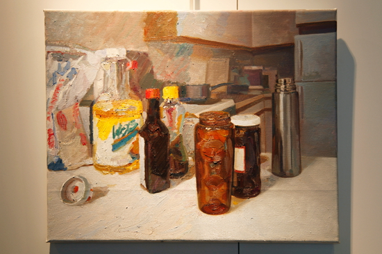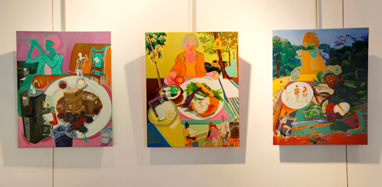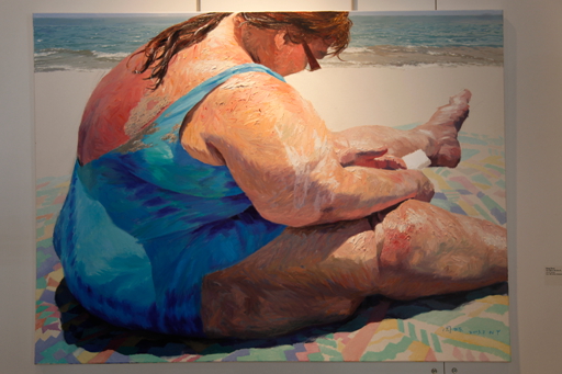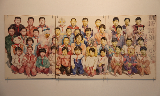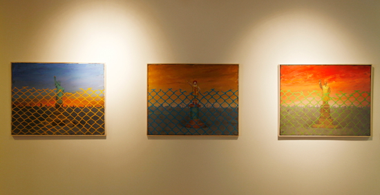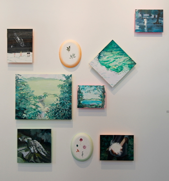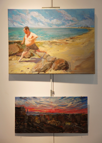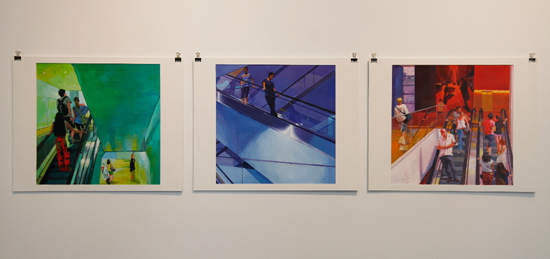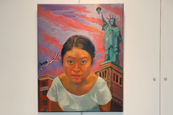 来自中央美院的年轻艺术家在纽约游历创作的作品,融入了文化冲击带来的新鲜元素,又隐含着在新文化中的焦虑感。纽约街头的多元文化特征体现在杜鹏骄和丁钰的作品。杜鹏骄抓住了这个五光十色的大都市不同族裔、职业、性别的面孔,拼贴在一起,像是快速闪回的胶片。丁钰则捕捉了在时代广场跳动的股票信息前的一张亚洲面孔——充满好奇的自己的面孔。魏颖同样也画了自画像不过她所表现的是处于画室内的场景,画面中镜子分割了远处的风景,同样自身也处于风景之中。而赵沛然及曲丹儿把自己的切身感受明确的体现在画面中,前者画了MOMA美术馆彩色灯光的扶梯,用几何分割的构图试图阐释人与人,人与空间的关系,后者则是把在纽约生活的琐事串联起的细节以一种超现实的手法,错乱的空间,以及斑斓的色彩记录在画面中。范墨把他童年记忆中的集体合影中移植入美国文化的卡通符号。袁伟和周栋则抓住了美国中产阶级夏日的典型生活——海滩度假。周栋笔下的胖女人专心地晒着太阳,用粗犷的笔触表现出晒红皮肤上新鲜泥土的痕迹。苑瑗以一组尺寸可变的小油画表现了自己在纽约的状态,没有摩天大楼和车水马龙,安静的湖泊和星辰让人出离喧嚣。赵一霓的一组风景油画延续了自己对中国传统文人画内观境界的追求,近乎抽象的线条注重对内心的反映,艺术家说在纽约的体验让她找到了更准确的语言,在图像的表达上也更自由。李兴达的《墙》则用幽默的语言反映出无所不在的隔阂。自由女神、毛泽东和麦当劳小丑站在纪念碑的基石上,以统一的姿势挥手。观者的视线被雕像前横空出现的篱笆所阻挡,不知自己身处墙内还是墙外。