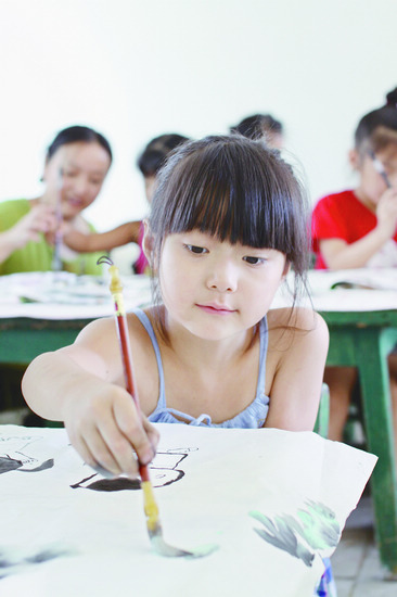 成都市书协副主席赵安如告诉记者,去年夏天成都市文联发动50位书画家深入到都江堰市胥家镇大林社区开展少儿书画培训,教他们“做堂堂正正中国人,写漂漂亮亮中国字”,用画面描绘美好新家园。为此,大林社区成立了书法、国画两个班,每个班50人上下,“老师们轮流去上课,一周上两次,孩子们很喜欢,每次上课都早早就等在教室门口,看着他们期盼的眼神,我心里真是五味杂陈,我们应该早点去,应该常常去。不过孩子们开心,我也跟着高兴。有几个孩子学得很快,是好苗子。”书法家王德育对记者谈他去上课的感受。他还建议,成都市文联能组织编印适合短期培训的教材,这样老师轮流讲课的时候也方便沟通,以便课程能顺利衔接。