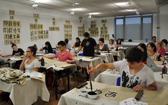图为中国人民大学国际书法班教学现场。