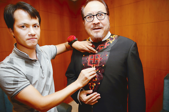 8月14日,著名歌唱家田浩江在发布会上试演出服。