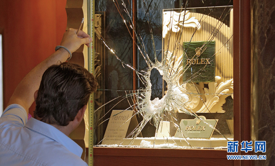 当地时间8月16日,法国南部尼斯佩特雷宫殿展览过程中一处防盗玻璃被窃贼敲碎,数块名贵品牌手表如劳力士等被盗。而就在不久前,法国尼斯附近的戛纳一次展出中,价值4000万欧元的珠宝与名表被窃贼洗劫。图片来源:东方ic