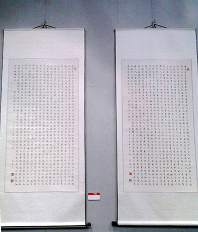 爱国书法展作品由张益三(楷书专家)、国墨林(将军书法家)、刘振声(行草专家)三位我国知名书法家的作品组成。已故楷书大家张益三的作品令人称奇,他在绢上书写的蝇头小楷(孙子兵法)长约10米,笔笔匠心独运,他书写的(前后出师表),字字精雕细刻。使人留连忘返,难以忘怀。将军书法家国墨林书写的条幅“坚决听命党和祖国的召唤”、“空谈误国、实干兴邦”等作品,令人观后激情满怀,荡气回肠。行草大家刘振声的书法作品条幅(但使龙城飞将在 不教胡马度阴山)、(扬眉剑出鞘)、(好男儿志在四方)、(军无戏言)、(爱我中华 保卫边疆)、(把一切献给伟大祖国)、(气冲霄汉)等作品苍劲有力,让观者热血沸腾。