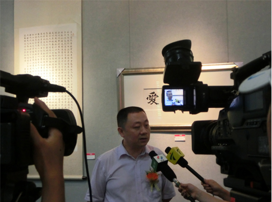 爱国书法展总策划、八路军老战士文工团团长焦歌在开募式上发表了讲话,他说:国共合作期间,于1937年8月,在国民党的一次高级国防会议上宣布八路军正式成立。抗日战争中在中国共产党领导下,八路军、新四军和各族人民英勇抗击倭寇,给侵略者以沉重打击,为抗战的胜利做出了重大贡献。八路军的平型关大捷和百团大战对抗日战争的全面胜利起到了至关重要的作用。今天,世界政治格局变幻莫测,日本右翼势力又在蠢蠢欲动。爱国教育,刻不容缓。八路军老战士文工团策划主办 “当代名家爱国书法展”来纪念中国人民抗日战争暨世界反法西斯战争胜利68周年,就是为了让大家铭记这段历史。每一名中华儿女都要居安思危,时刻准备着,随时听从祖国的召唤,听命党的指挥!为实现伟大的中国梦多做贡献!