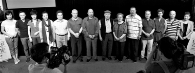 《天下归心》演员和主创昨日出席发布会。左起依次为翟墨、徐孟珂、张慧芳、袁慧琴、杨乃彭、安平、朱绍玉(作曲)、尚长荣、李鸣岩、陈霖苍(执行导演)、陈少云、史依弘、朱世慧、康静。肖一 摄