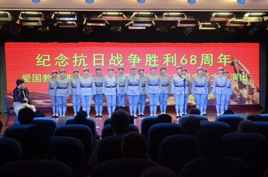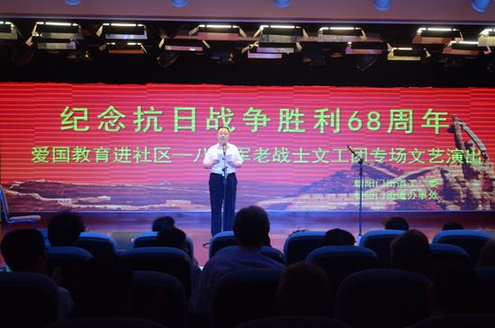 演出开始前,大屏幕播放了八路军老战士文工团摄制的专题片《爱国大业》。之后,团长焦歌发表讲话,他说:国共合作时期,于1937年8月,在国民党的一次高级会议上,宣布八路军正式成立。抗曰战争中,在中国共产党的领导下,八路军、新四军和各族人民英勇抗击倭寇,给侵略者以沉重打击,为抗战的胜利做出了重大贡献。八路军的平型关大捷和百团大战,对抗日战争的全面胜利起到了至关重要的作用。今天,世界政治格局变幻莫测,日本右翼势力又在蠢蠢欲动。我们今天走进社区举行庆祝纪念抗战胜利68周年文艺演出,就是为了让大家记住这段历史,每一名中华儿女都要居安思危,要深刻地意识到爱国教育刻不容缓。要时刻准备着听从祖国的召唤,听命党的指挥!为实现伟大的中国梦多做贡献!