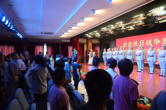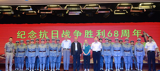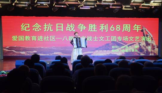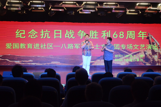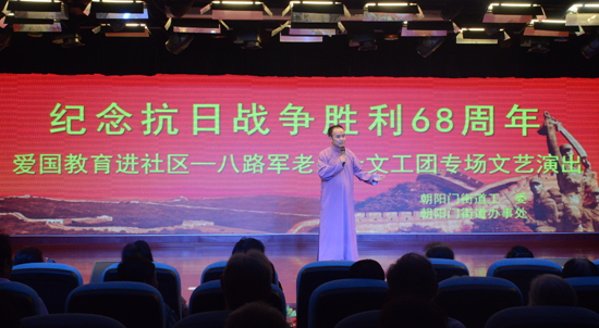 为大力弘扬爱国主义,9月3日下午八路军老战士文工团一行40余人,专程前往北京市东城区朝阳门街道办事处举行了——庆祝抗战胜利68周年爱国教育进社区专场文艺演出。中央国家机关老领导、八路军老战士文工团常务顾问:原全国大常委、中央文献研究室主任逄先知同志,原中共中央委员、中央宣传部部长王忍之同志,中国文联原副主席、书记处书记胡珍同志。还有名誉顾问王利军同志、中国文联副主席刘兰芳同志,焦歌团长,及北京市有关方面负责同志邵丽红、陈大鹏等出席观看了演出。