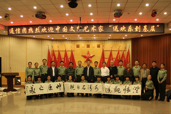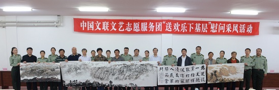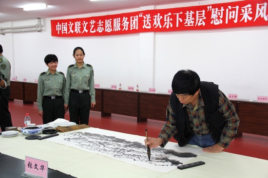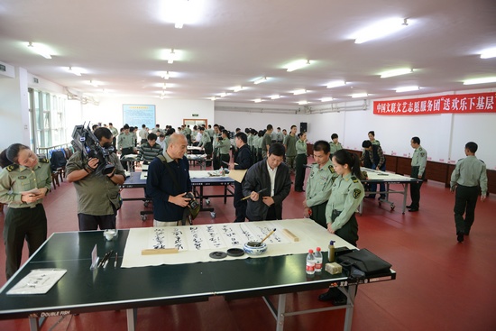 “这样的活动给我们带来了文化大餐,满足了我们的精神需求,感觉很解渴。”中国白城兵器试验中心的一位战士这样对记者说道。9月13日至15日,在中秋和国庆佳节即将到来之际,罗成琰、邵志军、陈洪武、王学岭、李胜洪、祁海峰、李耀林、张文华,郝远征、马恒福等有关方面负责人和艺术家组成的中国文联文艺志愿服务小分队,赴中国白城兵器试验中心开展“送欢乐、下基层”慰问采风活动,受到热烈欢迎。此次活动由中国文联文艺志愿服务中心、中国白城兵器试验中心联合主办,得到了中国美协、中国书协、中国摄协的大力支持,是中国文联贯彻落实党的十八大精神和全国宣传思想工作会议精神、深入开展党的群众路线教育实践活动的重要体现。
