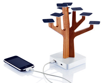这是一款树造型的太阳能充电器。9个树杈分别配有9块太阳能电池板。9块太阳能电池板连接到一个1350 m Ah可充电的锂电池上,能够用最快的速度吸收光能并转化为电能,为数码产品充电。