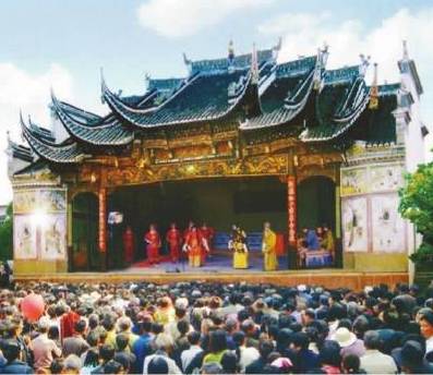 后来有条件到全国各地行走,日益领略了南方戏台的琳琅满目与斗彩争艳。与北方的厚重宏阔不同,南方戏台通常精巧灵动,屋檐愈加反翘飞升、装饰重累,台身愈加雕造夸饰、金裹银敷,台基也由北方的砖石垒砌改为柱撑架空的干阑式结构。许多顶部采用复杂华丽的累檐飞脊形式,内部则是重重叠叠的藻井结构,个个争奇斗艳、彼此称胜。戏台各处往往镶嵌众多的砖、石、木雕图案,镂空雕刻众多仙侣人物、亭台楼阁、山水花鸟、祥禽瑞兽,显现了高精的雕造工艺和追巧的审美趋势。福建、广东的戏台更是敷粉彩、镶金饰、贴陶砖、堆灰塑,把个戏台层层累累堆积做销金窟,这种风格影响了港澳台地区甚至整个东南亚。其他如牌匾的精致讲究,楹联的奇巧工稳,书法艺术的极度弘扬,都成为古戏台的看点,引你流连忘返。北方人到此往往会被其金玉富贵的氛围所裹胁,强烈感受到民风的浮华艳丽。南方也见到更多戏台的类型,水畔戏台、桥上戏台、宗祠戏台等,走在江南大地上,时时会有着惊喜的发现。至于临时用蓬席搭建的戏台,以往年节时一定城乡比比皆是,今天反映在许多明清绘画里,我也搜集了许多例证。