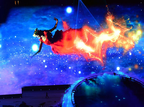 “比如,今年演出中的空中威亚秀群体表演,在两个方面已经达到了世界领先的水平,第一是变换的速度非常快,此次表演中威亚变换速度是奥运会和亚运会的一倍以上,第二在中心场地的横、纵向表演的电脑控制技术已经领先世界,比伦敦奥运会还要精确很多。”路建康说。