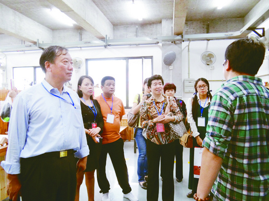 张志学(左一)、徐岫鹃(左四)与民间工艺杰出传承人一起参观中国美院基地 张德玉 摄