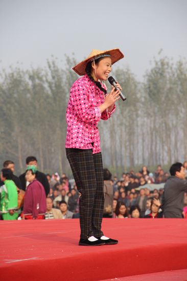 这台演出的参演人员全部来自群众中间——既包括成安镇夕阳红表演队、大名县草编时尚模特队这种完全由村民构成的业余演队伍;也包括以草帽姐为代表的《星光大道》草根明星;还有白军选等从成安县走出的《星光大道》选手。这些名符其实的群众演员,为乡亲们呈现的节目乡土气息浓郁:秧歌《大丰收》、武术《梅花拳传奇》、平调《炉中火》……街坊邻里和草根明星一起站上舞台,展示拿手绝活,让台下的乡亲们都瞪大了眼睛、伸长了耳朵,生怕错过每一个招式、每一句歌词。他们的表演没有固步自封的形态,充满了灵动和生机。在《大丰收》结束后,村里的大娘还突然变换台阵,从兜里掏出墨镜,表演起了骑马舞。虽然舞姿并不标准,却引起了台下超过一万名村民的欢呼喝彩。大家都感叹,没有想到平时种地的行家里手居然也可以这么“潮”。甚至那些没有座位、就在旁边玉米地和棉田的拖拉机上站着观看演出的村民,也大声叫好。