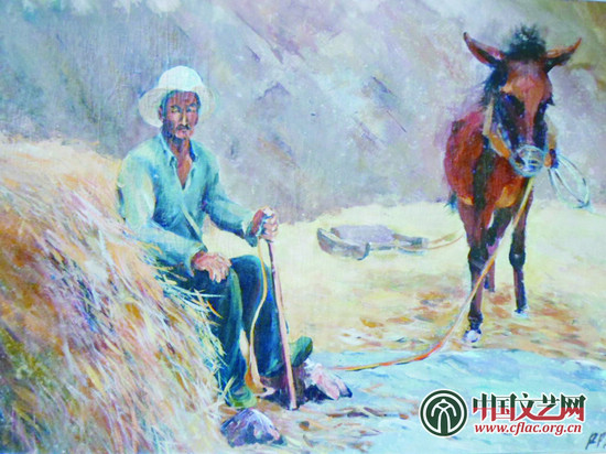 《农忙季节》创作者王锐平系中国文联武都支教点安化初级中学美术教师。作品描绘的是武都夏收时节,农民们用原始传统的方式碾收小麦,画中的劳动者和他的骡子在劳作间隙稍作休息,从农民黝黑、瘦长的脸庞,安静的表情,反映了当地人的生活不易和劳作繁重。