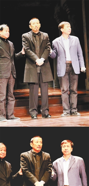 前晚,陈道明在北京人艺院长张和平(左)和书记马欣(右)搀扶下登台向观众致歉。