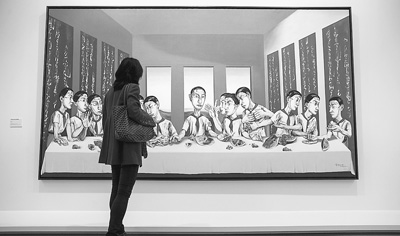 参观者在欣赏中国画家曾梵志的作品《最后的晚餐》。资料图片