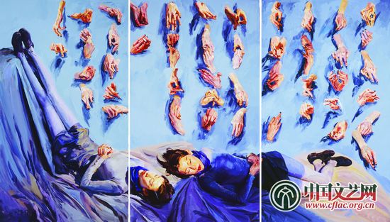 展览分为两个部分,展厅入口左侧展出的6幅形式感极强的3联绘画,分别命名为《素手》《深潭》《迷夜》《蚊帐》《记忆盒》及《抽屉》。喻红说:“绘画在表述情绪忧郁的时候更为困难,它不像戏剧、文学那么准确、直观。”喻红身边一些情感特别丰富细腻的朋友时常被忧郁的情绪所困,这6幅新作分别以6个人物为主角,从人物对物件及某些习惯的依赖,勾勒出人物的个性与细节,体现出最深切脆弱的情感,幻梦般的构图使作品升华超越情绪与精神本身,呈现出艺术家更为深刻的人文关怀。喻红以独特的艺术描绘方式将她身为艺术家及观察者在时代变化下的价值思考投射在这6幅画作上。