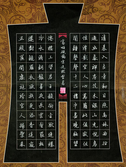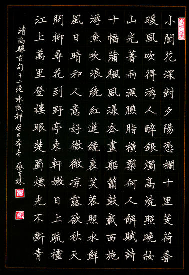 这是用奶油笔在黑纸上创作的碑楷作品,作者张百林