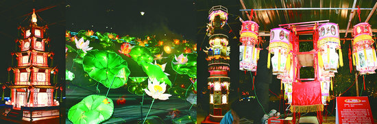 陕西民协制作的彩灯《花好月圆》,体现的主题为“花好月圆人长寿,风调雨顺岁平安”,表达了人民群众热爱生活和向往美好未来的虔诚心愿;福建民协选送的彩灯《荷塘月色》,灯组造型由荷叶、荷花及莲蓬等构成,完美地表达了“接天莲叶无穷碧,映日荷花别样红”的景观场面;参展的《百鸟朝凤》,在12米的平台上展现出百鸟前来朝贺凤凰的壮丽场面,以此体现出中华各民族向往和平与祈福平安的传统寓意;来自山东民协的彩灯《论语》,作品出于对孔子的由衷爱戴与尊敬,别出心裁地制作出人物与书籍交相辉映的灯彩艺术,并通过观众喜闻乐见的表现手法,再现了一代圣人的睿智与慈祥;闹春是一种民间习俗,四川省民协选送的《闹春图》描绘了一个形态可掬的童子俏皮地提着喜庆吉祥的灯笼,欢天喜地迎接春的到来,预示新年吉祥如意,来年繁荣昌盛。