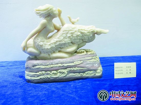 石雕之作《心语》,确立主人翁形象为现代少女,采用通体洁白、光滑如玉的叶蜡石量身定做,其相由心生来自对石料的定夺,视之“全白”为俏色,突出利用一色无瑕、白净可人的美感来表现“美女”,成型规划就整块石料打造,定位与其它石雕美女不同,以人物与自然界生灵为背景,通过心灵语言与肢体表达,体现人与自然密切交融与和谐之主题,使之具有浪漫主义抒情意味,期许给人带来更多美好解读,这是此作不离创新构思的创意。在立体构成的造型上,为使人物显露优美姿态,关键是要把人物形体结构比例拿捏精准,让线条概括富有弹性可见流畅的曲线美,尤其手臂手形需刻画舒服得体,尽量抛弃概念化,这一点必须思想明确,我自从到中国美院进修雕塑后对此更为在意。此作,系结合工艺雕塑探索石雕新美女的实验,目的也在于与众不同显见看点。