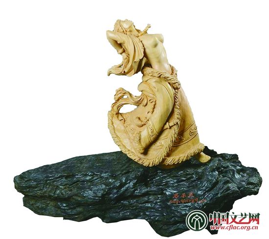 ——创作需讲创意,而其往往有劳心志。作《高原美》选用整段大叶黄杨木,体量比小叶黄杨木大,宜做气势较大的单体人物,构思使之伴随中国梦起舞,以外在形象体现内涵,历经权衡,自觉表现藏族女性形象最为理想,一是她们能歌善舞,在美丽神秘和高寒缺氧的世界屋脊上奋起,其形象超凡脱俗;二是伟大的中国梦想属于全体中华儿女,通过藏族女性形象向天歌舞姿,足可见证当今神州大地处处洒满阳光。如何让“她”尽情舞动起来,确保不失豪放和别具雕塑感,可达形同纪念碑之壮观,作为我对此作的追求,而能否把握效果最需费思量。旨在出新是多方面的,包括在雕刻上不流于程式,也需打定主意把握刀法跟进审时度势,驱使不拘一格有助塑造人物形象同样值得一试。