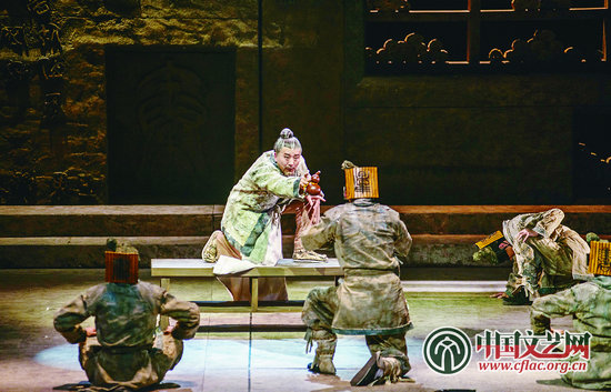 无论从剧本还是导演、表演、舞美,《伏生》都呈现出严谨的创作风貌,呈现出国家级院团的示范性品质。幕启,秦砖汉瓦的布景,将人们带到了那个遥远的时代。历史上法、儒两家的矛盾,在舞台上,化为秦相李斯与大儒伏生的矛盾,李斯处心积虑、步步相逼,伏生虚与委蛇、忍辱偷生。焚书坑儒之际,伏生为保存下他脑海里的儒家典籍《尚书》,牺牲了自己的儿子子勃,妻子为此撞墙自尽,女儿羲娥因而伤心绝望,弃之而去。剧末,秦亡汉兴,受尽人间苦难的伏生终于可以重新讲授儒家经典,羲娥也回到了父亲身旁,可汉武帝“罢黜百家,独尊儒术”,令伏生再度困惑……