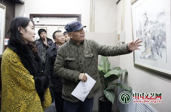 著名画家马海方与王永芬在画展现场交流艺术创作 中国文艺网 韩雪竹 摄