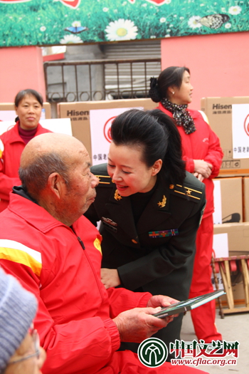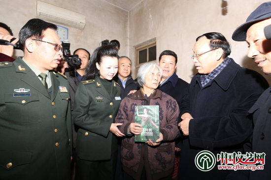 姚林辉随中国老龄事业发展基金会理事长李宝库到村民家中看望并送上她在人民大会堂举行的作品演唱会光盘