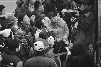 考生及家长在北影校园内查看成绩