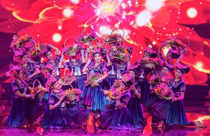 新时代的文艺作品需要在传承中创新。兼收并蓄、多元交融的表现形式不约而同的进入文艺创作者的视野。去年广西文艺舞台高潮迭起,为庆祝广西60周年大庆活动推出了一系列文艺新作,如民族舞剧《花界人间》、舞剧《刘三姐》、交响音乐会《壮乡和韵》等作品就是例证。晚会选取了其中的代表——全国文华奖广西推荐剧目、民族舞剧《花界人间》片段:女子群舞《采花》和第五届“荷花少年”全国舞蹈展演节目:男子舞蹈《蛙鸣雨落》,两者都展现了民族风格舞蹈语汇,借鉴了现代性的文艺元素,通过巧妙的舞蹈编排设计,作品呈现出多元性和多样化的表演形式,展现了广西多民族艺术的独特魅力。中西合璧器乐合奏《我的祖国》也是如此,中国的民族吹、打、弹、拨乐器与西洋管弦乐器在这首曲子里争奇斗艳,但却相得益彰。