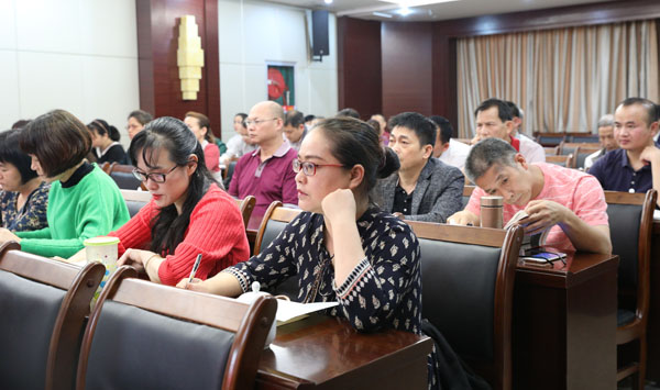 图为崇左市文联主席农恒云主持“我和我的祖国”笔会文学讲座