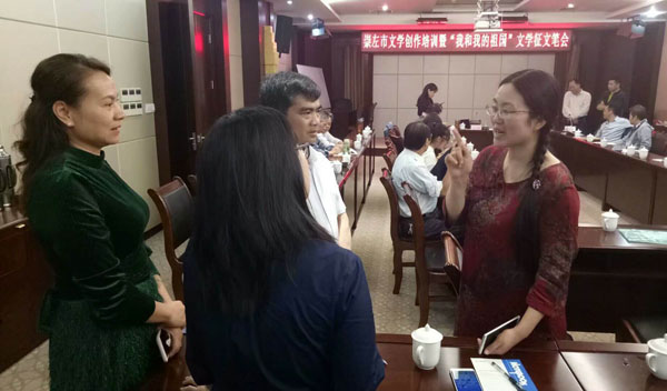图为文学沙龙休憩间隙,高密籍作家秋如(右一)与崇左本土作家交流创作心得