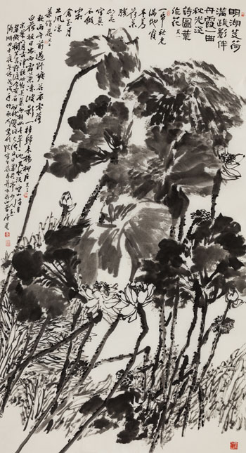 唐建作品:明湖芰荷满 疏影伴丹霞 98cm×198cm 纸本水墨 2018年